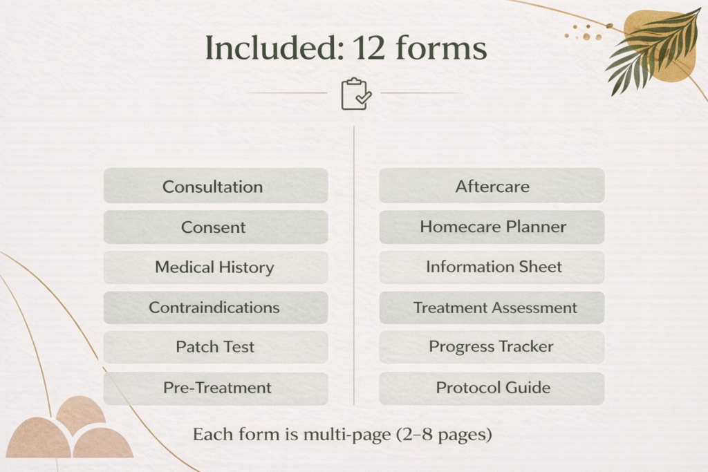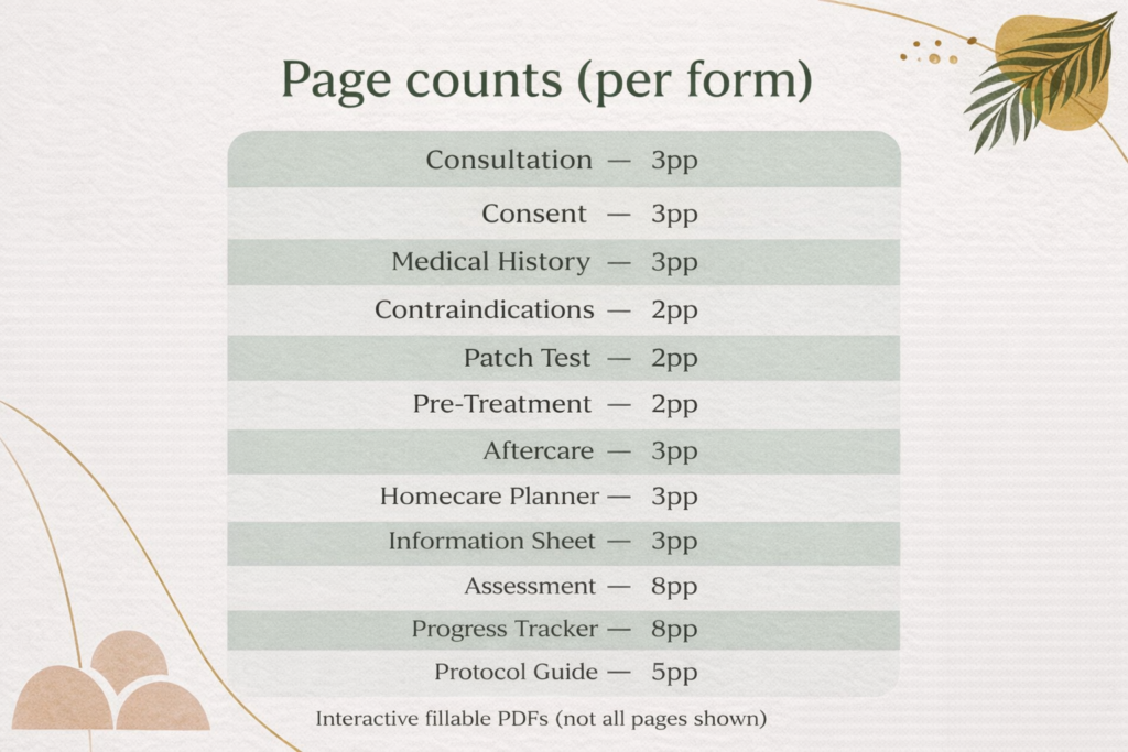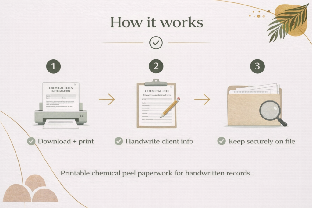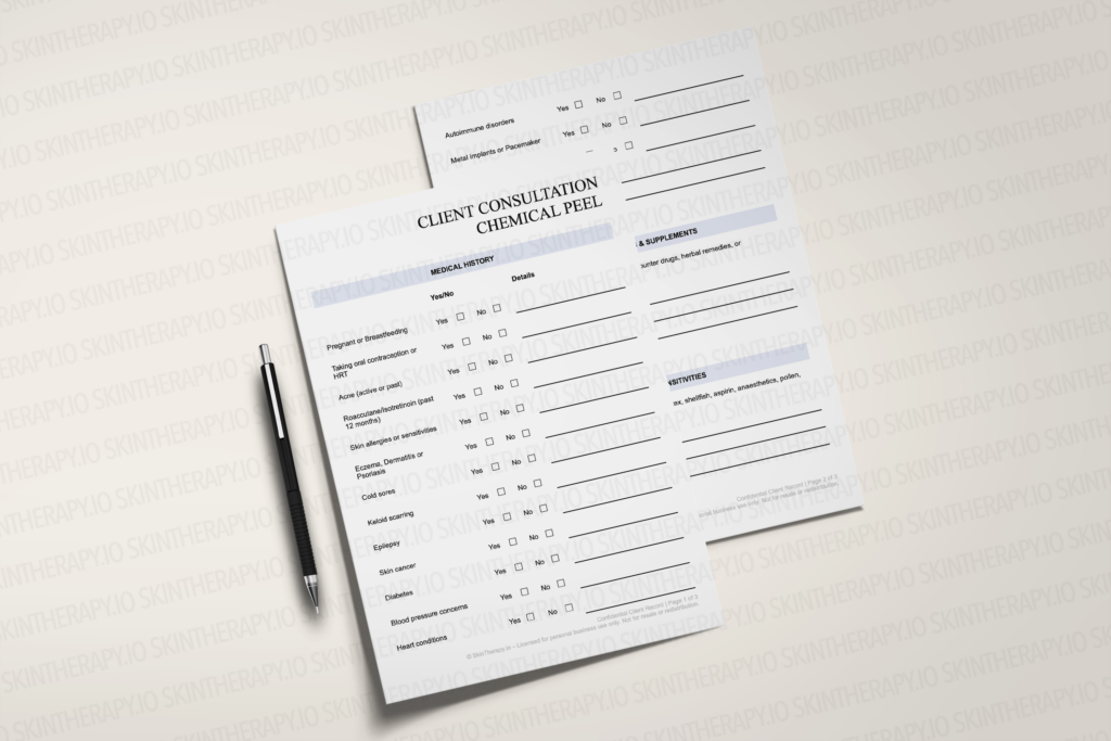 Consultation forms, treatment trackers and practitioner documentation are designed to support safe and professional chemical peel treatments.