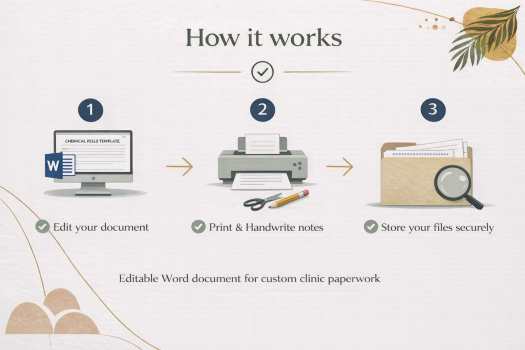 Chemical peel treatments require careful consultation, treatment tracking and aftercare guidance. Clear documentation helps practitioners maintain professional standards, track treatment progress, and demonstrate responsible practice.